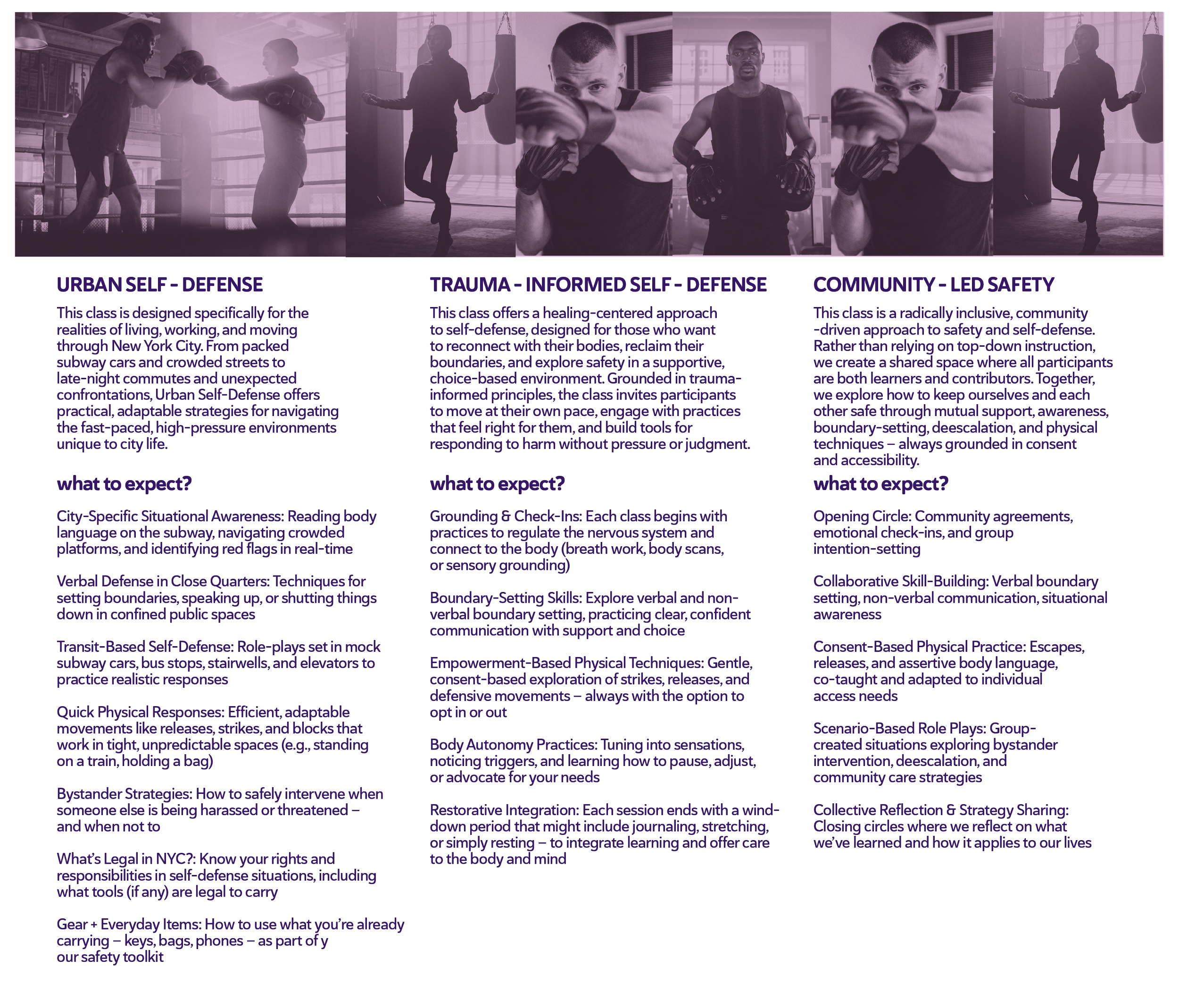 Programs include trauma-informed self-defense, which focuses on emotional awareness and personal agency, as well as community-led safety classes that prioritize non-hierarchical learning and group empowerment. Each offering is designed to foster both practical skills and a strong sense of connection among participants.